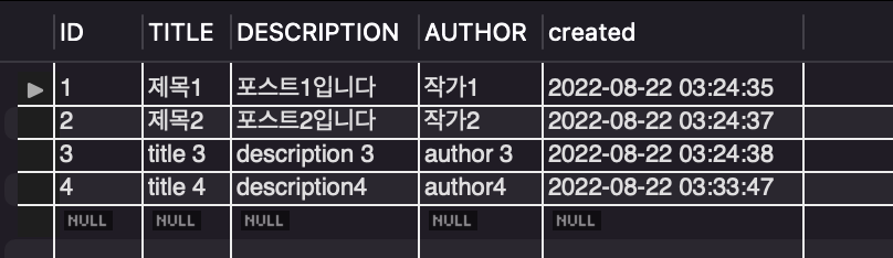 INSERT INTO topic(ID, TITLE, DESCRIPTION, AUTHOR) VALUES(1,'제목1', '포스트1입니다', '작가1' );